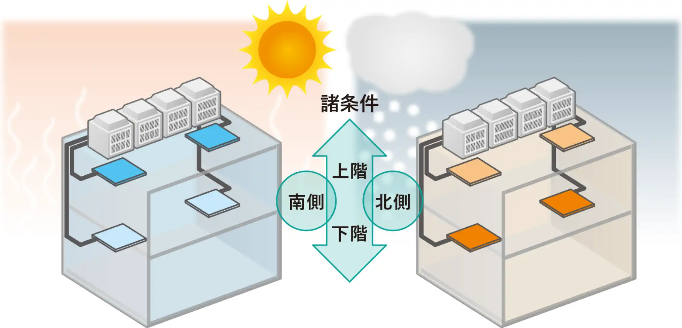 建物の上層階と下層階、あるいは北側と南側では空調要求度が異なります。ISSは、特許技術の時分割デマンド制御方式でエアコン1台毎をきめ細かくコントロールできるため、一般的なデマンド・コントローラのように最も条件の悪い部屋のエアコンに合わせてデマンド目標値を設定する必要がなく、低めのデマンド目標で運用できます。(特許登録第4137632号-平成24年 発明大賞受賞)